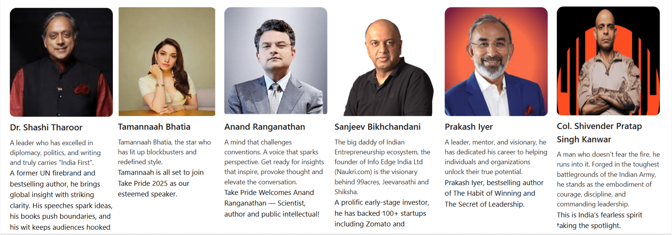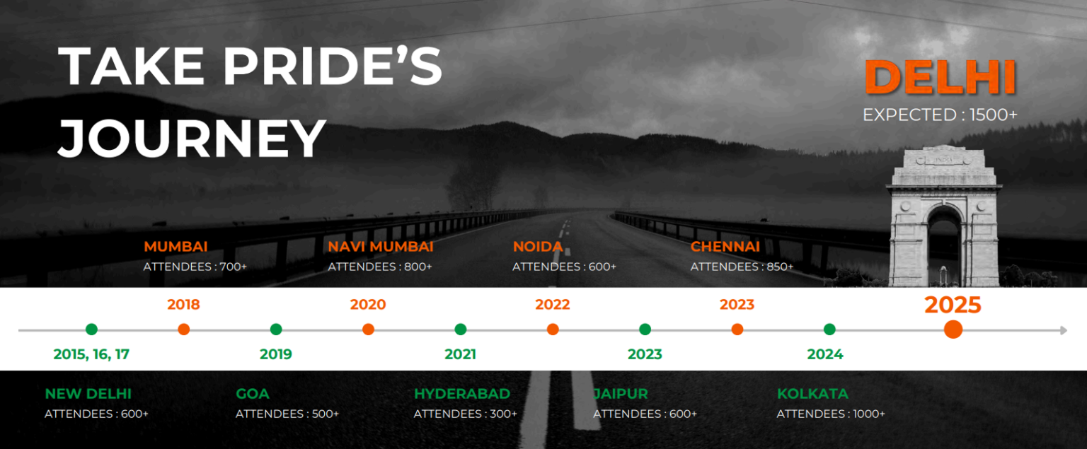 Every year, we see a congregation of more than 1000 Young Indians – leaders, entrepreneurs, professionals who are the agents of change. Yes, they are the future of the Nation on whose shoulders lie the responsibility of taking India ahead towards progress. Beginning with a broadminded & inclusive outlook and a strong will to turn words into action, TAKE PRIDE is all about working together for a better India.